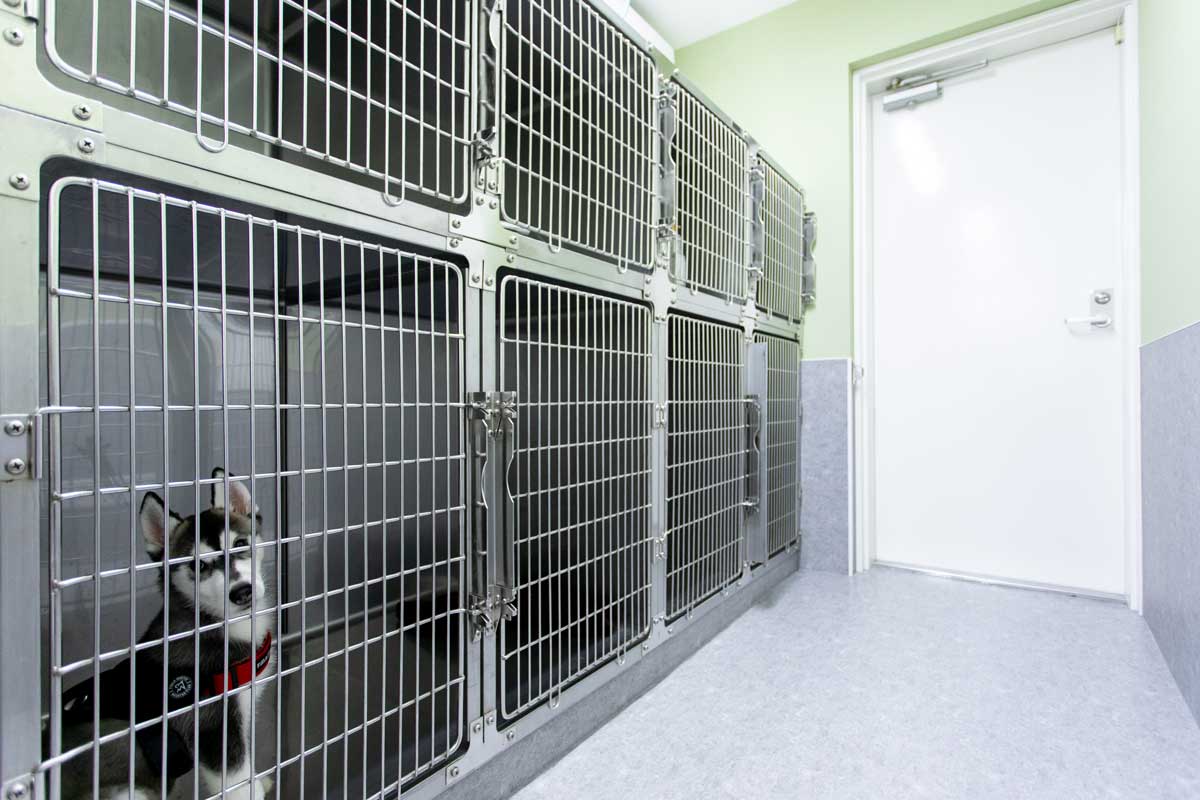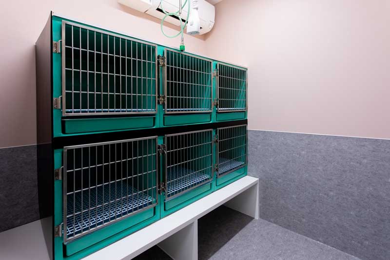 小型犬から大型犬の子まで入院が可能です。早く体調が良くなってお外を駆け回れるよう、芝生をイメージした緑の壁紙になっております。